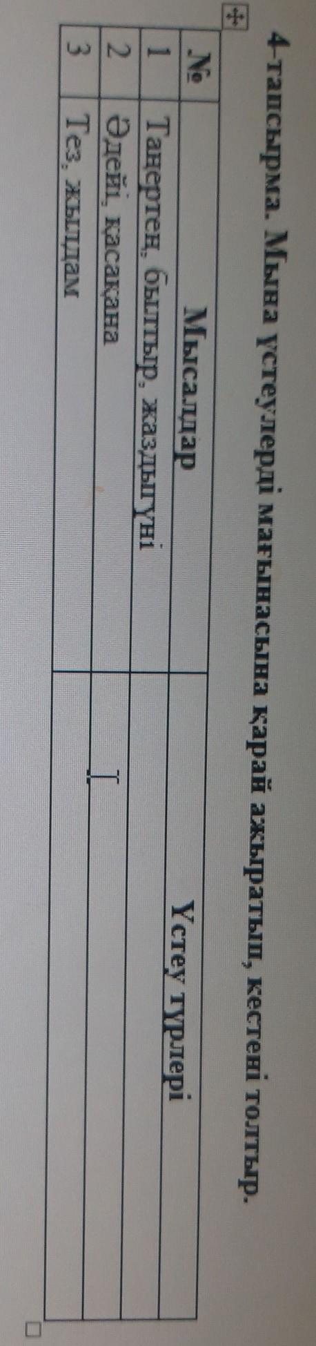 4-тапсырма. Мына үстеулерді мағынасына қарай ажыратып, кестені толтыр.