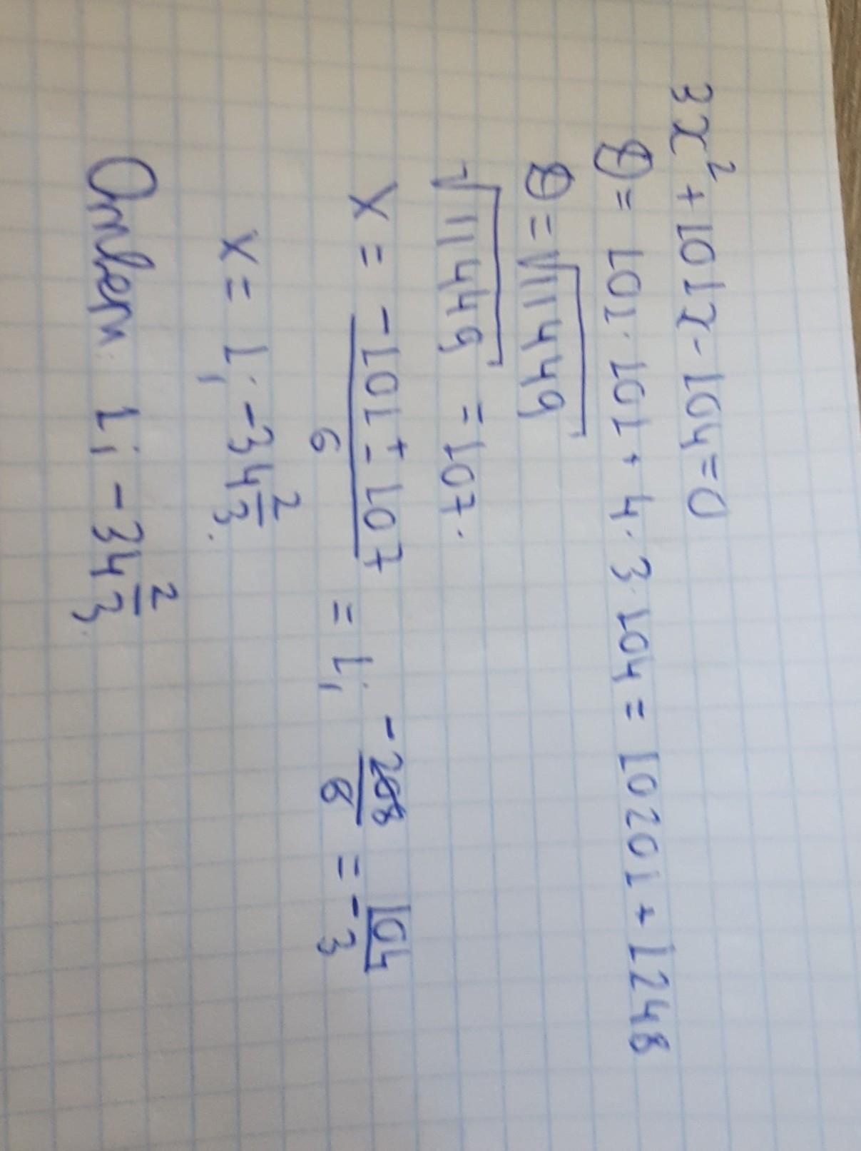 3x^2-3x+104x-104=0;3x(x-1)+104(x-1)=0;(x-1)(3x+104)=0;x=1;x=-104/3=-34 2/3