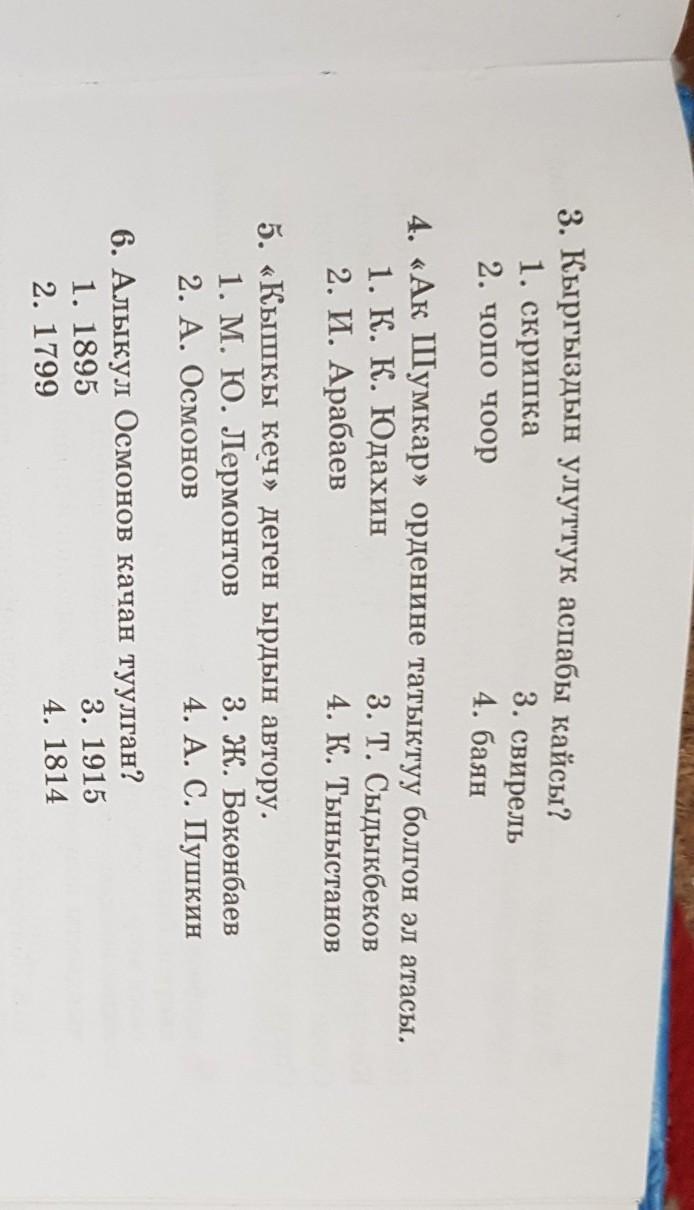 3.Кургуздыкы чопо чоор 4.Т. Сыдыкбеков 5.А. С Пушкин 6.1895 туулган.