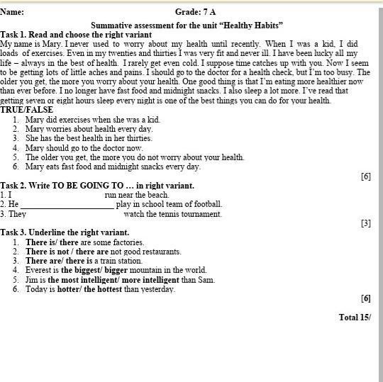 Summative assessment for the unit “Healthy Habits”