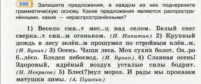 Всело сияет(=)месяц(-)над селом(распространённое).Белый снег(-)сверкает(=) синим огоньком(распространённое).Крупный дождь(-) в лесу зелёном прошумел(=) по стройным клёнам.(распространённое).Осень(-) (нераспространённое,односоставное).Чащи(-) леса(распространённое).Мох(-) сухих болот(распространённое).Озеро(-) белёсо(озеро=)(нераспространённое).Бледен(=)небосвод(-)(нераспространённое).Славная осень!(осень-)(нераспространённое).Здоровый,ядрёный воздух(-) усталые силы бодрит(=)(распространённое).Блеснул(=)мороз(-)(нераспространённое).И рады(=)мы(-) проказам матушки зимы(распространённое).