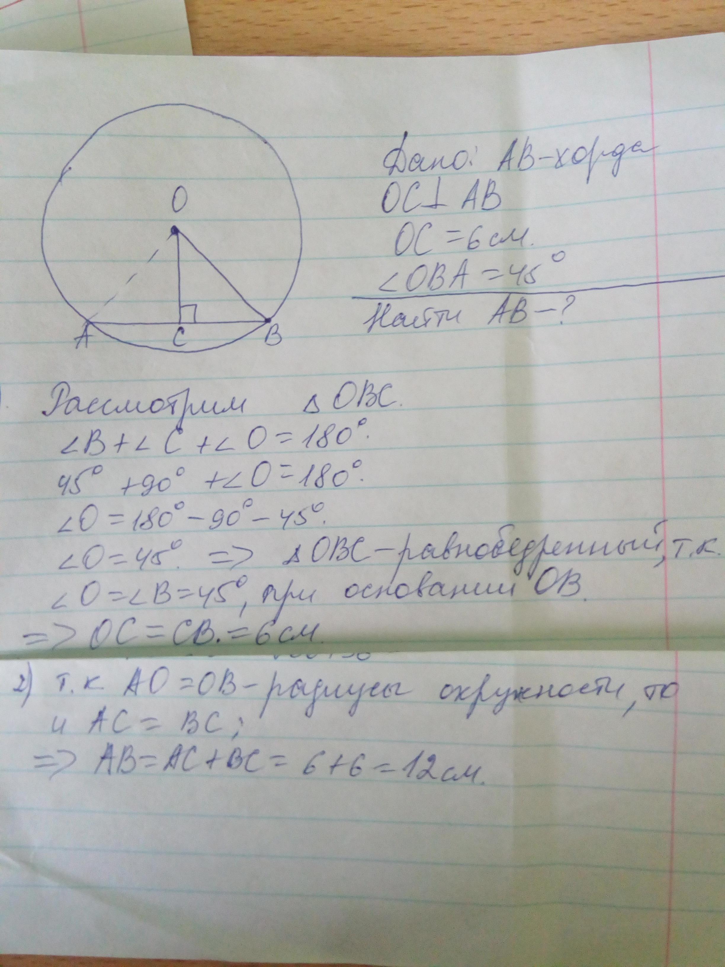 4. Из центра окружности О к хорде АВ, проведен перпендикуляр ОС. Найдите длину хорды, если ОС-6 см, ОBA-450°
