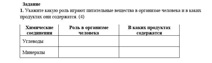 1. Укажите какую роль играют питательные вещества в организме человека и в каких продуктах они содержатся.