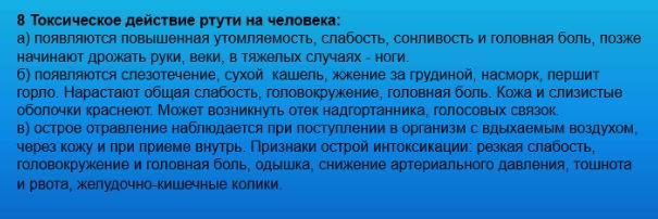 Гостре отруєння ртуттю проявляється через кілька годин після початку отруєння. Симптоми гострого отруєння: загальна слабкість, відсутність апетиту, головний біль, біль під час ковтання, металевий присмак у роті, слиновиділення, набряк і кровоточивість ясен, блювання. Як правило, з'являються сильні болі в області живота й тазу, слизовий пронос (іноді з кров'ю). Нерідко спостерігається запалення легенів, катар верхніх дихальних шляхів, біль у грудях, кашель і задишка, часто сильний озноб. Температура тіла підвищується до 38-40 °C. У сечі постраждалого знаходять значну кількість ртуті. У найважчих випадках за кілька днів настає смерть постраждалого.