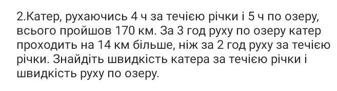 Швидкість руху катера за течією річки х км / год, по озеру у км / год. Система рівнянь: {4х + 5у = 170 ⇒ у = (170 - 4х) / 5 = 34 - 0,8 х {3у - 2х = 14 спосіб підстановки: 3 (34 - 0,8 х) - 2х = 14 102 - 2,4х - 2х = 14 - 4,4х = 14 - 102 - 4,4х = -88 х = - 88 / (-4,4) х = 20 (км / год) швидкість руху катера за течією річки у = 34 - 0,8 * 20 = 34 - 16 у = 18 (км / год) швидкість руху катера по озеру Ласкаво знизав