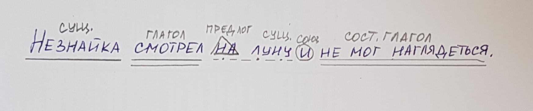 Выполни синтаксический разбор предложения в скобках обозначь вид предложения.по цели высказывания.по интонации по наличию второстепенных членов предложений.. Незнайка смотрел на Луну и не мог наглядеться