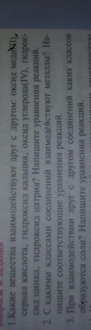 в третьем задании получается достаточно много вариаций, выписаны основные, пришедшие в голову. амфотерные оксиды и гидроксиды также могут реагировать с кислотами и щелочами; кислоты с нерастворимыми основаниями (2HCl + Cu(OH)2 = CuCl2 + 2H2O), щелочами (2H3PO4 + 3Ba(OH)2 = Ba3(PO4)2 + 6H2O)...