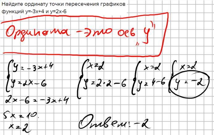Найдите ординату точки пересечения графиков функций y=-3x+4 и y=2x-6