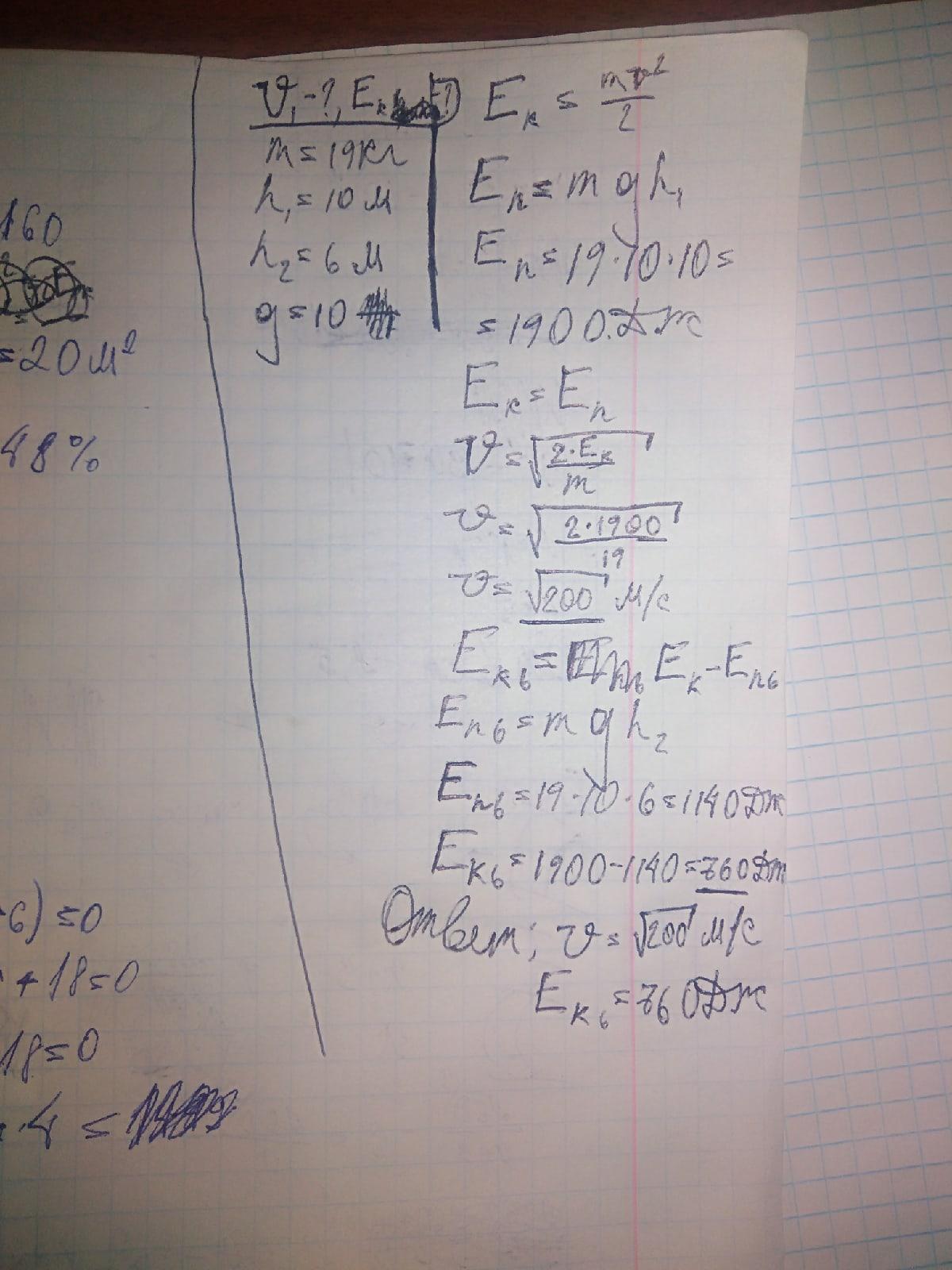 тело массой 19 кг бросают вверх на высоту 10 м. Найти начальную скорость броска и кинетическую энергию тела на высоте 6 м.Пожалуйста,очень срочно.Я просто пишу контрольную и не могу понять последнее задание!!!!!!!
