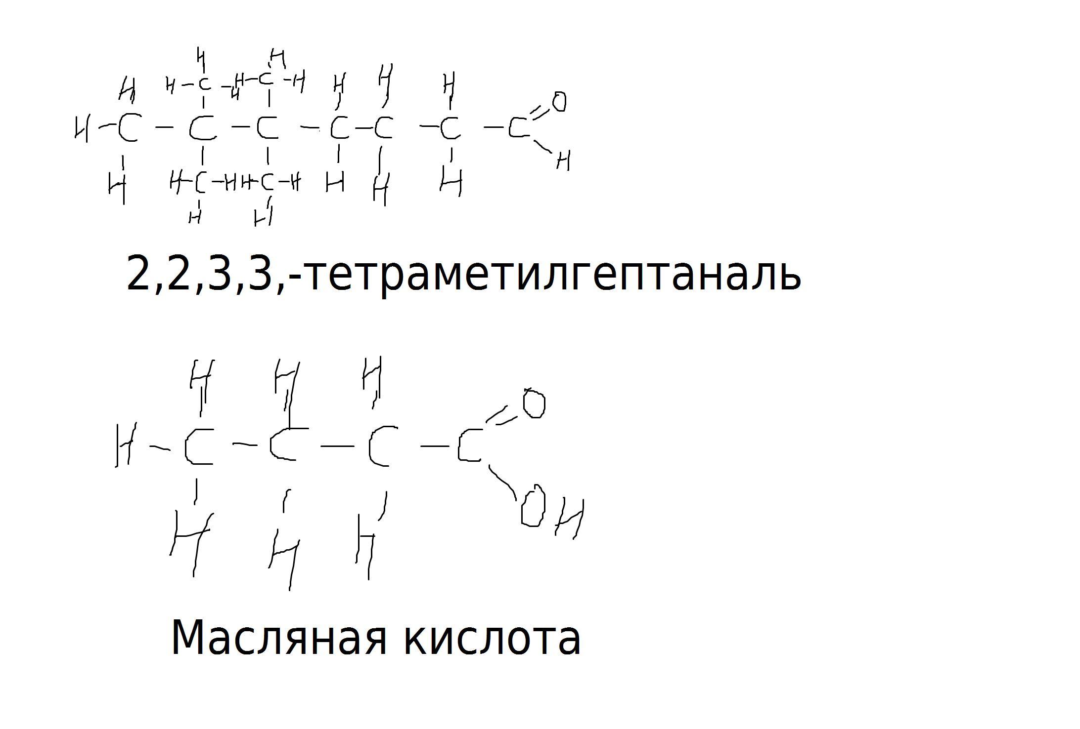 1) 2,2,3,3- тетраметил гептаналь 2) 3-метил масляная кислота