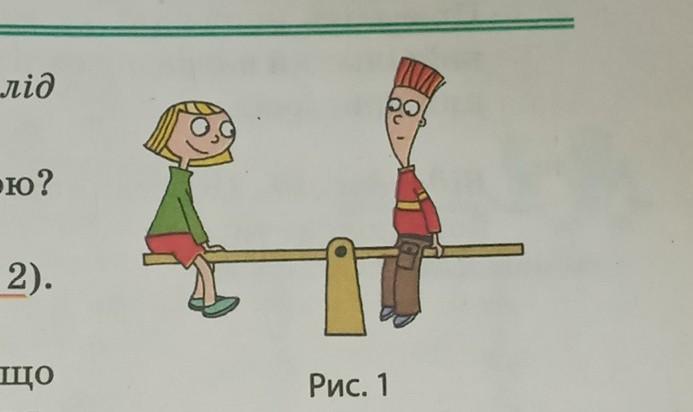 З рисунку видно, що важіль зрівноважений, а вага сили тяжіння дівчинки більше за вагу сили тяжіння хлопчика, тобто моменти їхніх сил однакові, а отже сила тяжіння дівчинки менша за силу тяжіння хлопчика. Отже і маса дівчинки менша за масу хлопчика.