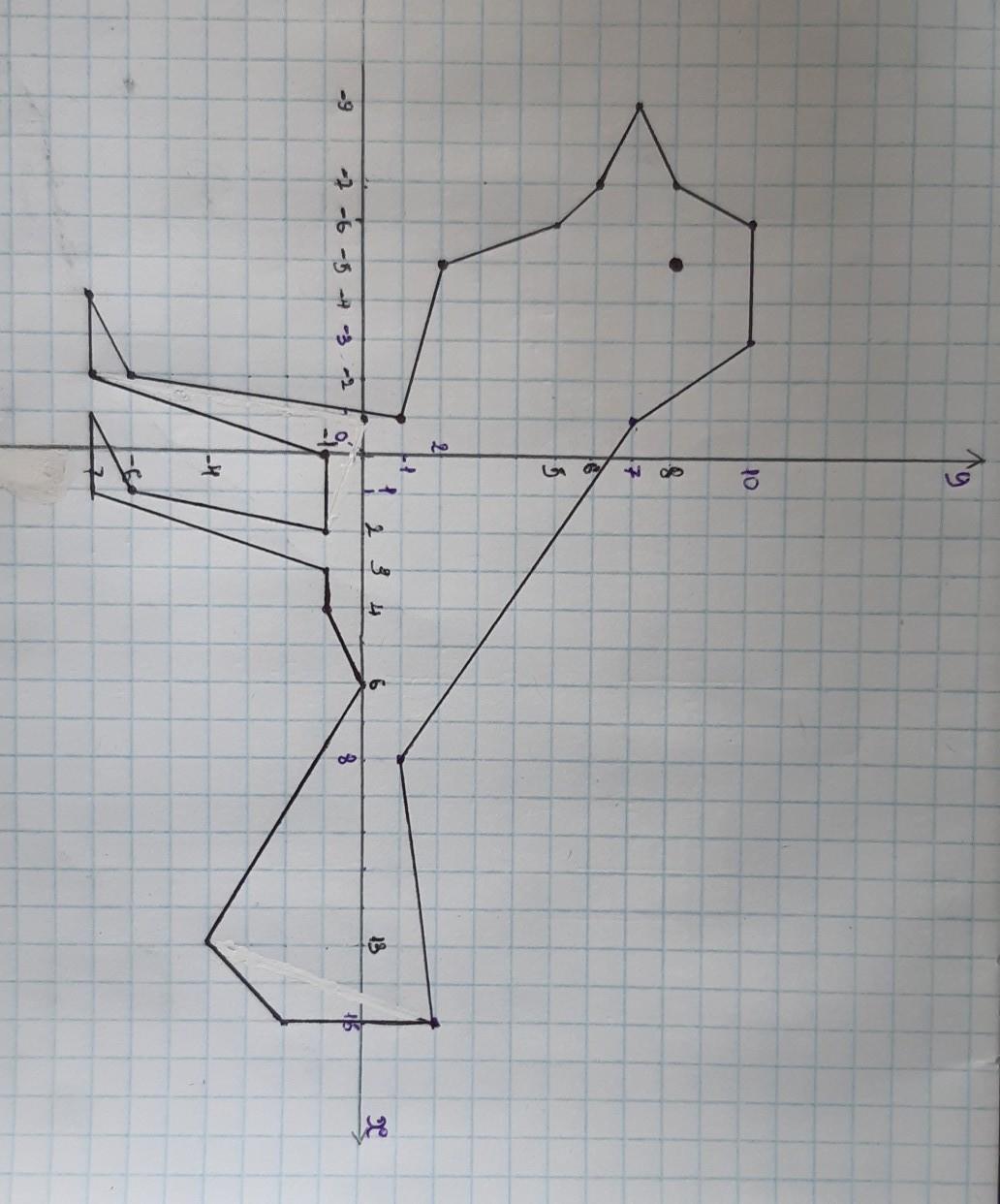 Рисунок по координатам.(15;2),(8;1),(-1;7),(-3;10),(-6;10),(-7;8),(-9;7),(-7;6),(-6;5),(-5;2),(-1;1),(-2;-6),(-4;-7),(-2;-7),(0;-1),(2;-1),(1;-6),(-1;-7),(1;-7),(3;-1),(4;-1),(6;0),(13;-4),(15;-2) глаз (-5;8)