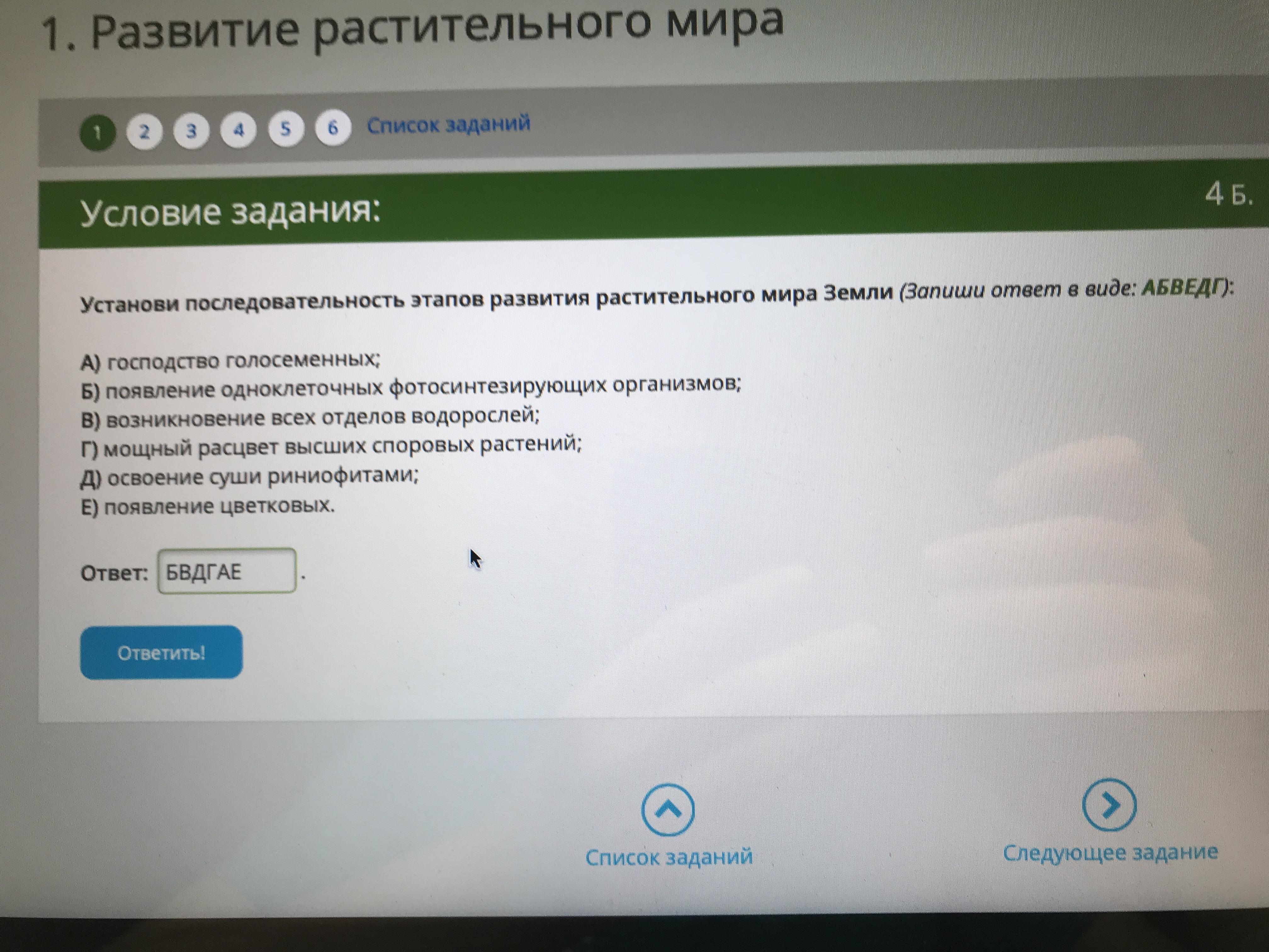Установите последовательность этапов развития растительного мира Земли (Запиши ответ в виде: АБВЕДГ)