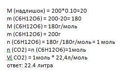 Який об’єм Карбон (IV) оксиду виділиться, при спиртовому бродінні 200 г. глюкози, що містить 10 % домішок?