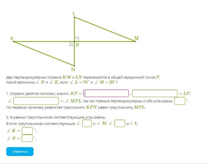 Два перпендикулярных отрезка KM и LN пересекаются в общей серединной точке P.