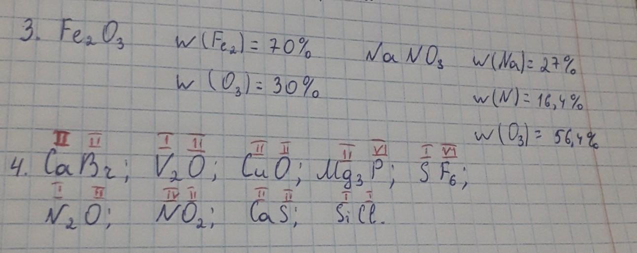 4.Определите валентности химических элементов ,и обозначьте их над знаками элементов римскими цифрами: CaBr; V2O; CuO; Mg3P; SF6; N2O; NO2; CaS; SiCl.
