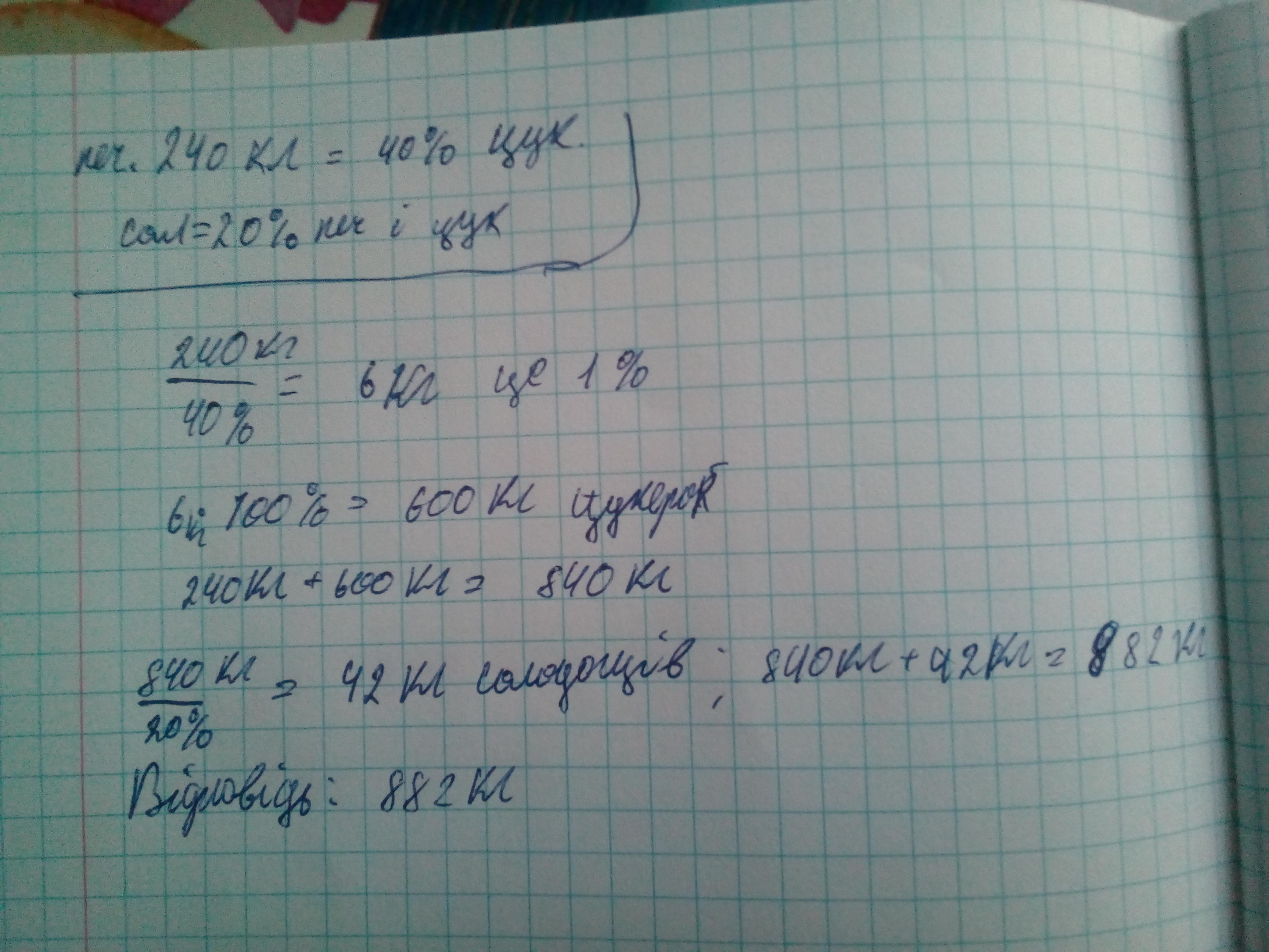 В магазин завезли кондитерські вироби, з них 240 кг печива, що складало 40% від ваги цукерок. Інші солодощі важили 20% від спільної ваги печива і цукерок. Скільки кондитерських виробів завезли до магазину.