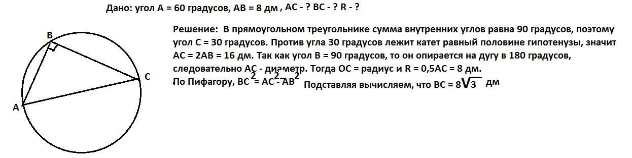 Ответ: R= 8 дм, ВС = 8 дм, АС = 16 дм