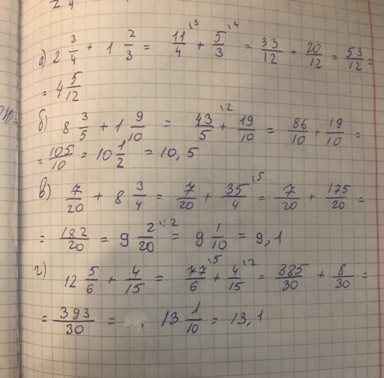 а) 2 целых 3/4 + 1 целых 2/3