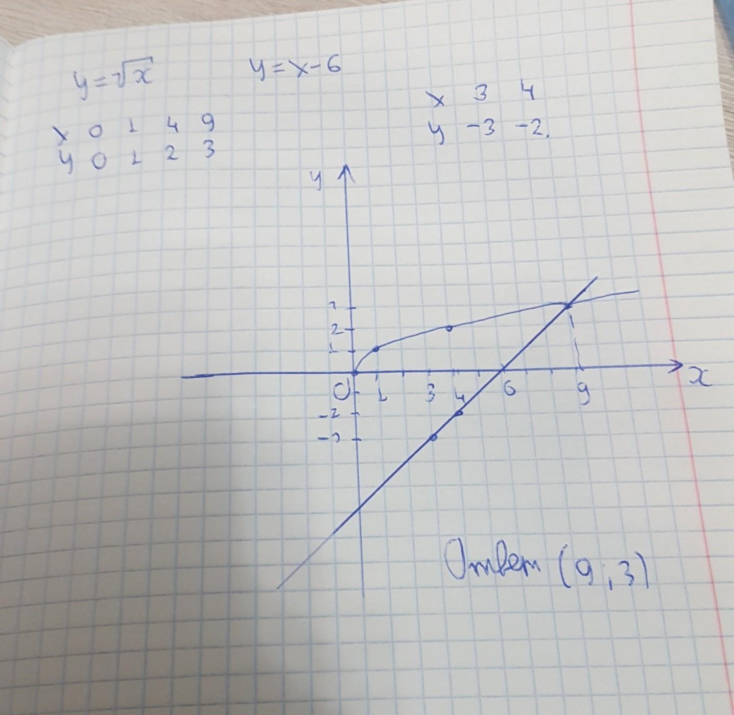 Побудуйте в одній системі координат графіки функцій у=√х і у= х-6 та визначте координати точки їхнього перетину