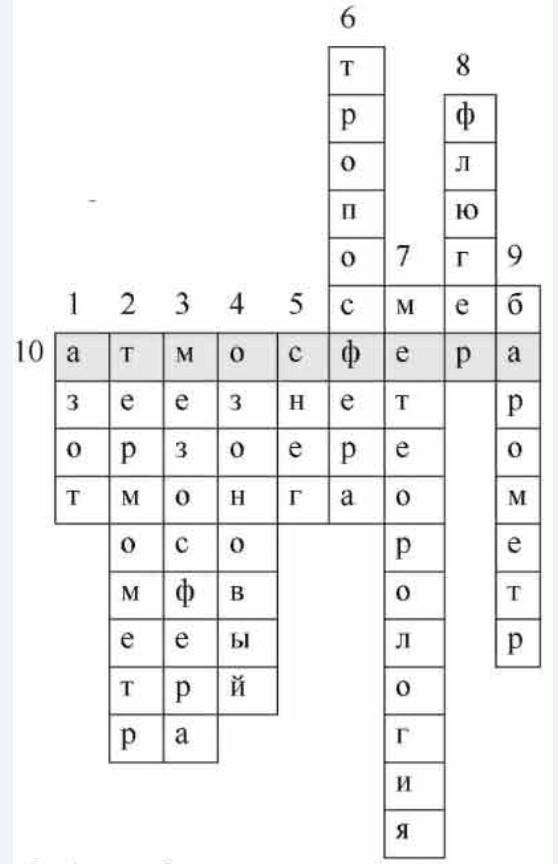 9. Прибор для измерения давления воздуха (Барометр). 10Воздушная оболочка Земли (слово по горизонтали - атмосфера).