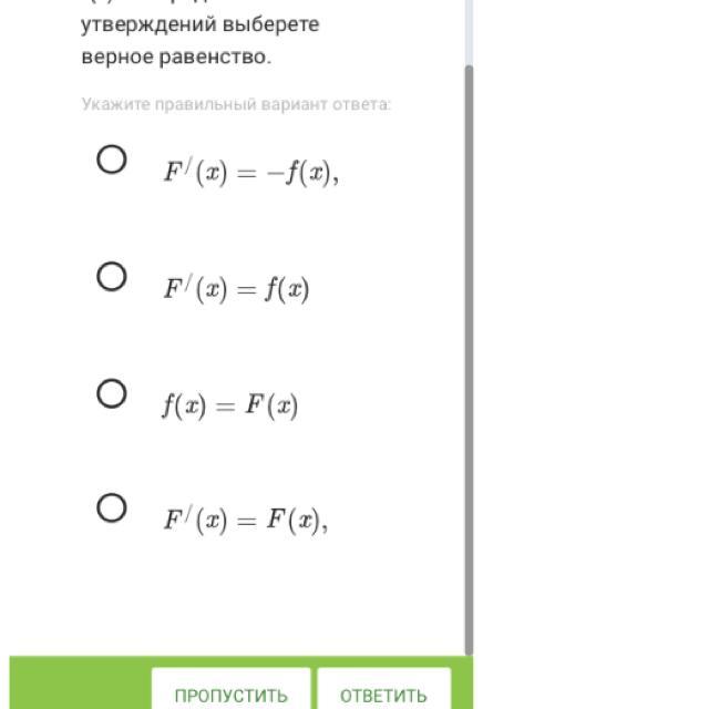 Пусть функция F(x) является первообразной для функции f(x). Из предложенных утверждений выберете верное равенство.