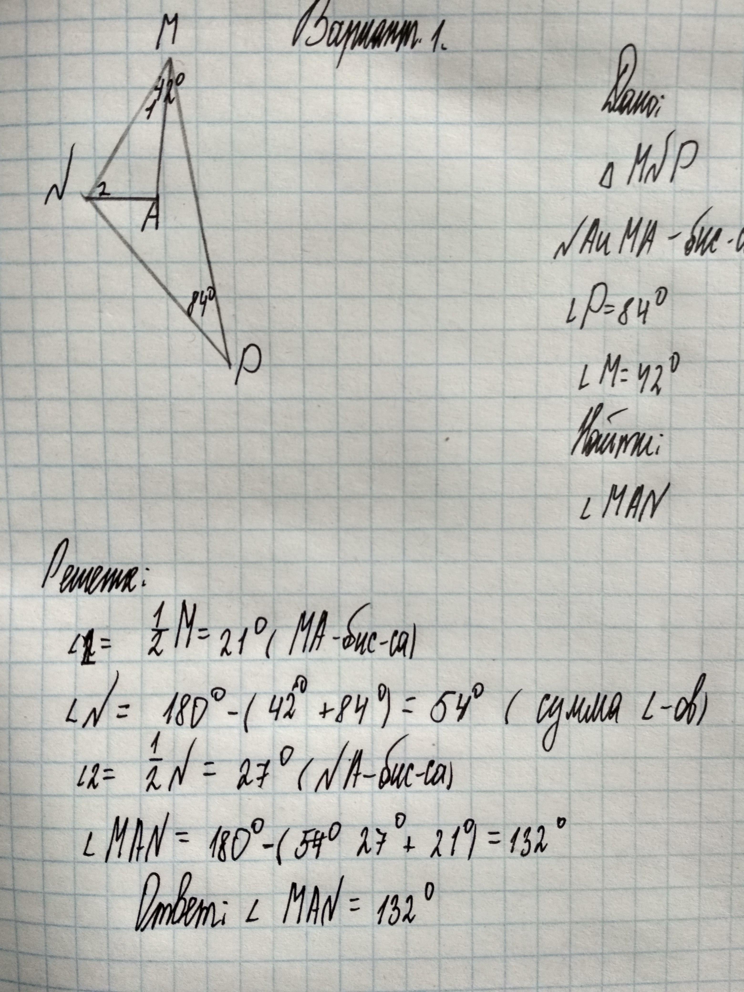Биссектрисы углов N и M треугольника MNP пересекаются в точке A. Найдите угол MAN , если угол P равен 84 градусов, а угол M равен 42 градуса. ПОЖАЛУЙСТАААА!!!!!