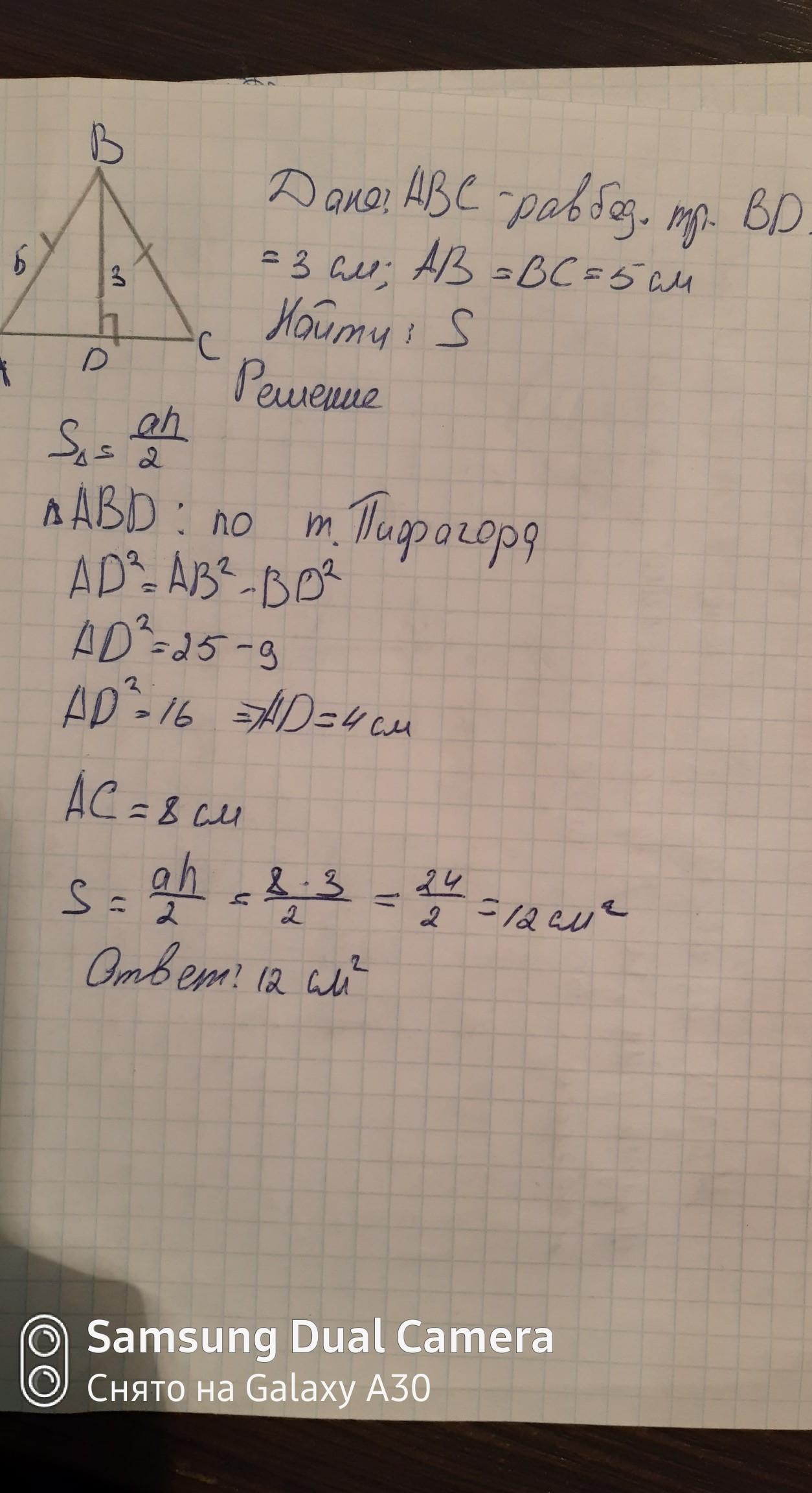 Висота рівнобедреного трикутника проведена до основи дорівнює 3 см, а бічна сторона 5 см. Знайдіть площу трикутника