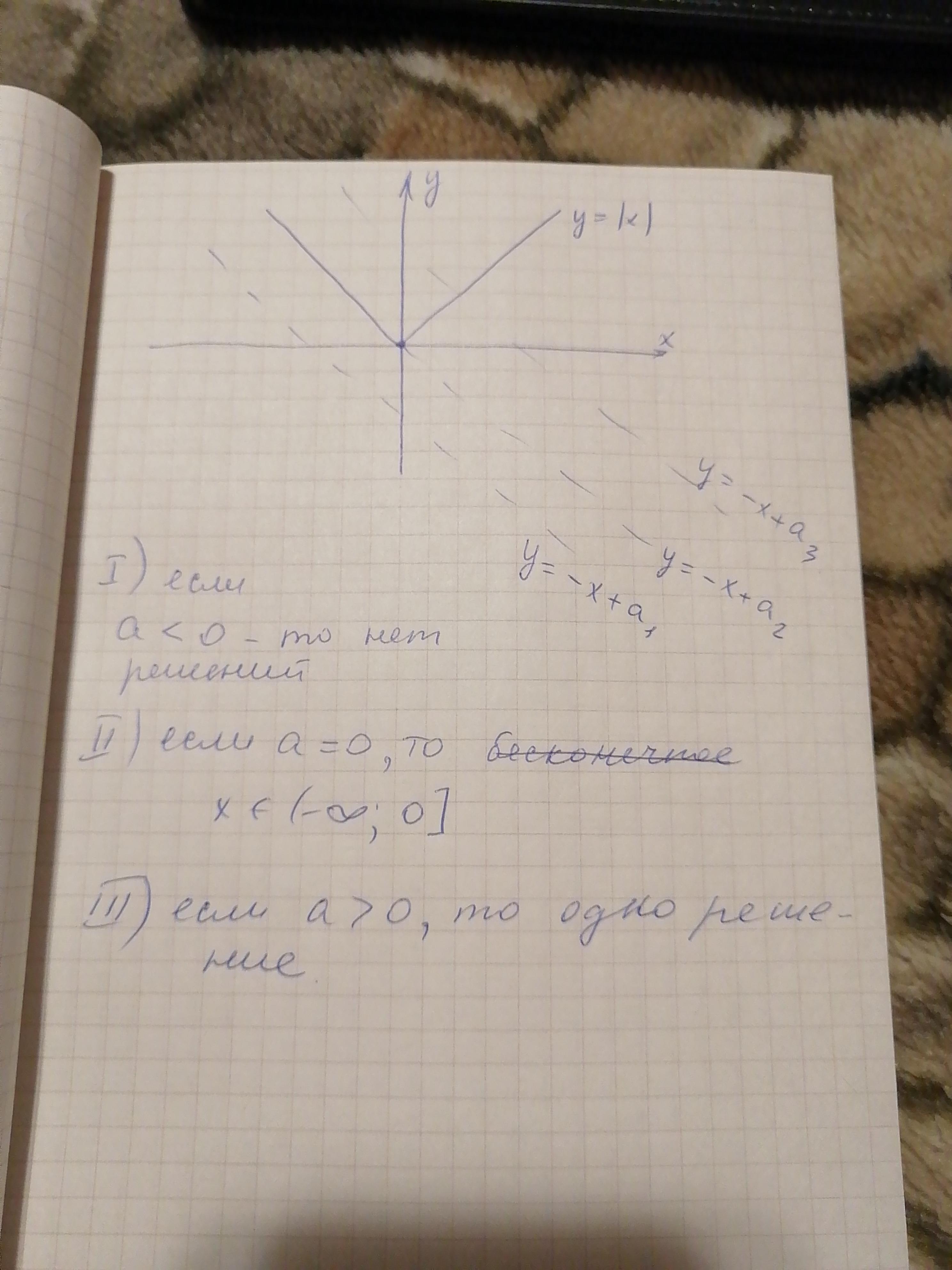 (прямая "накладывается" на левую ветвь, то есть каждая точка левой ветви принадлежит y = -x+a, а этих точек бесконечно много)