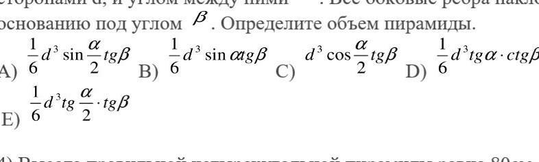 3)Основанием пирамиды служит равнобедренный треугольник с боковыми сторонами d, и углом между ними . Все боковые ребра наклонены к основанию под углом . Определите объем пирамиды.