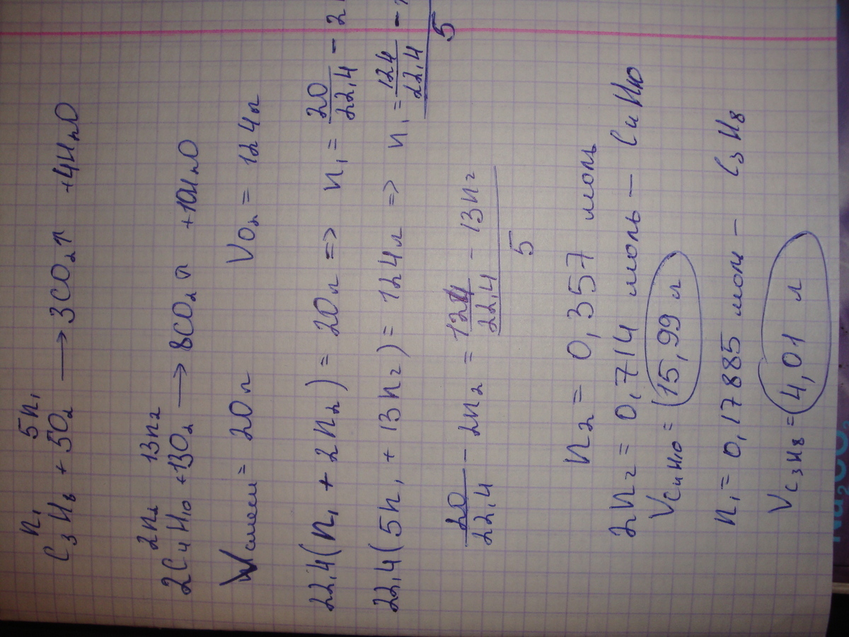 для сжигания 20л (н.у.) смеси пропана и бутана израсходованно124л (н.у) кислорода. определите состам смеси алканов.