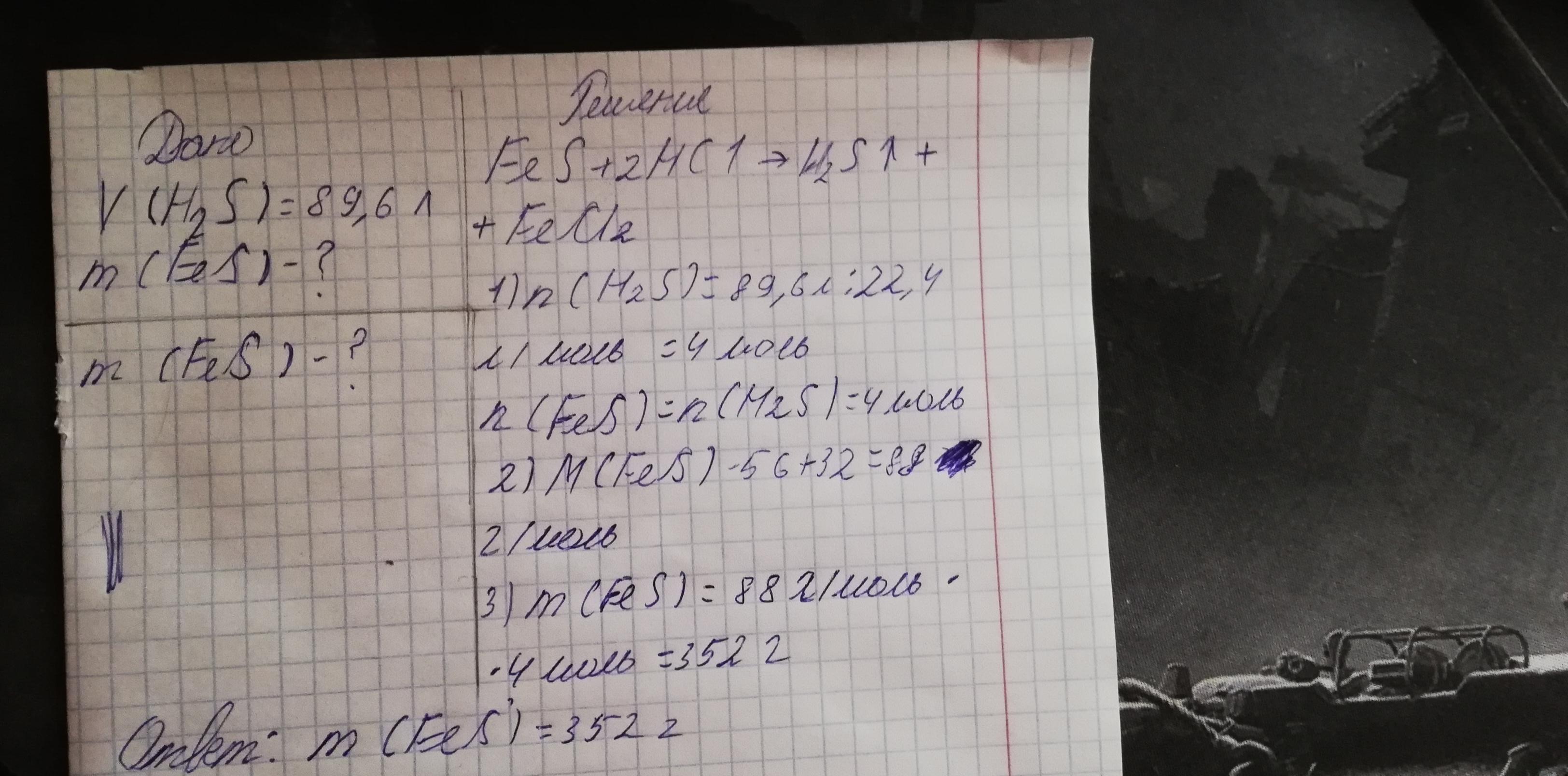Рассчитайте массу сульфида железа (//), который прореагировал с 89,6л соляной кислотой, при этом в результате реакции выделился сероводород *