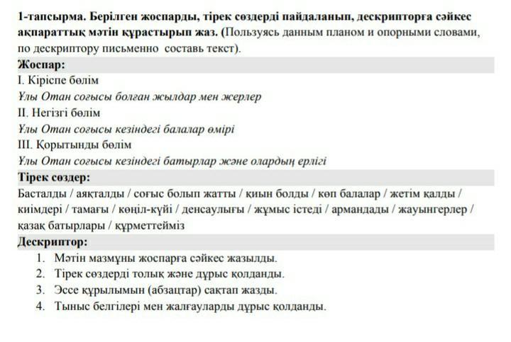 Улы отан согыс болып жатты , ол кезде жагдай оте кыйн болды. Балалар жетим калды. Олар конил куилерине де, денсаулыктарына да карамастан кимдери мен тамактарын табу ушин жумыс жасады . Согыстагы жауынгерлер женис кунин коп армандады. Ол онайга туспеди. Жауга тосин тигип ел ушин, жер ушин улкен ерликпен аткарды. Биз Б.Момышулы,
