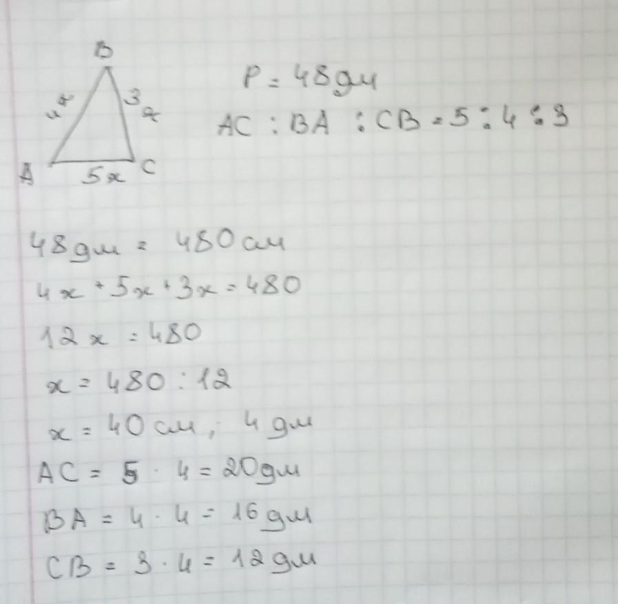 Периметр треугольника BCA равен 48 дм. Определи стороны треугольника, если известно их соотношение AC:BA:CB=5:4:3.