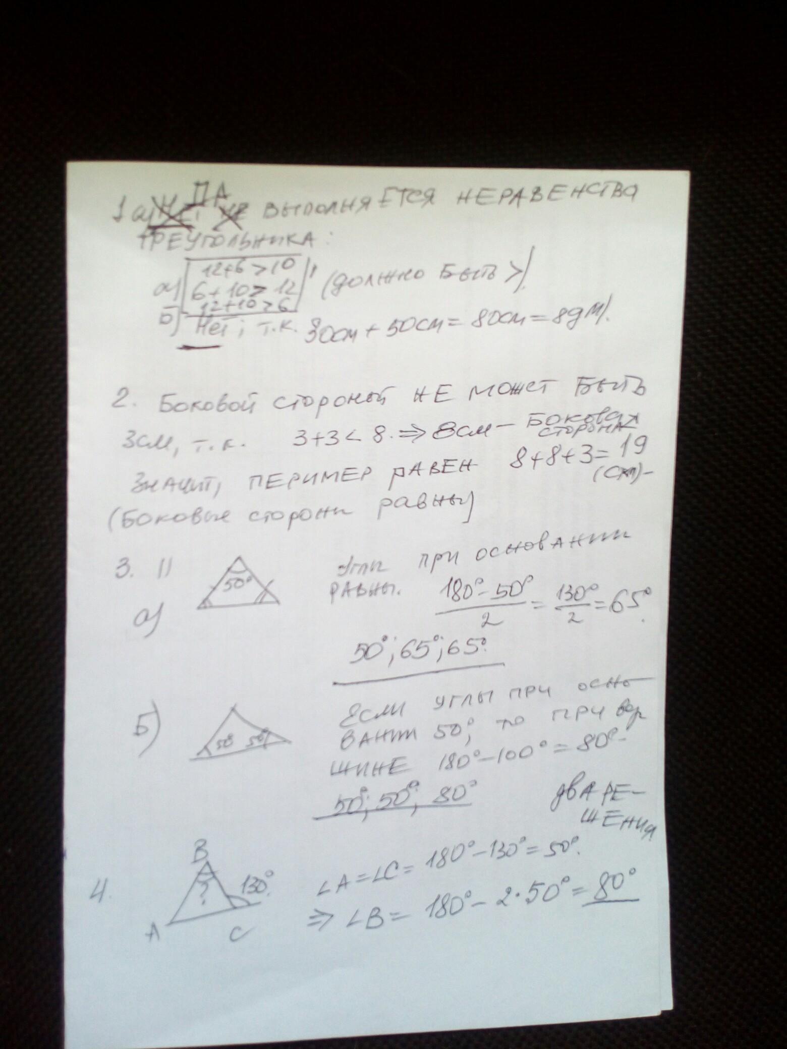 4.Внешний угол при основании равнобедренного треугольника равен 130 градусов.