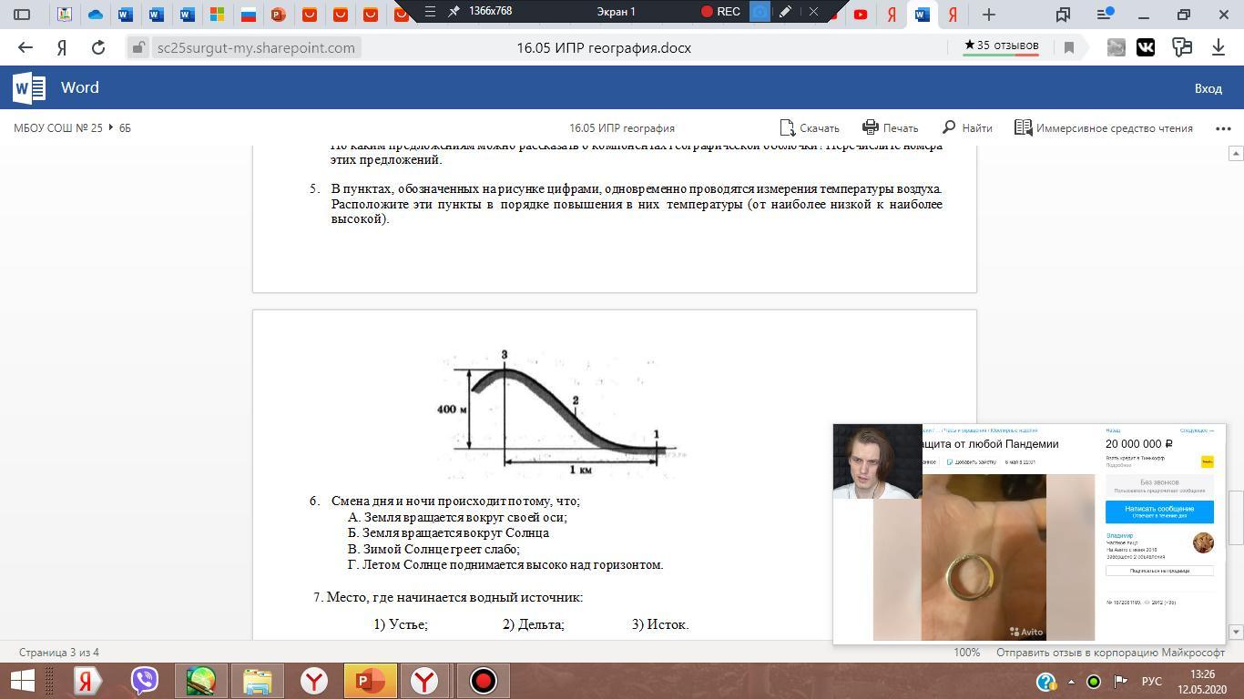 В пунктах, обозначенных на рисунке цифрами, одновременно проводятся измерения температуры воздуха. Расположите эти пункты в порядке повышения в них температуры (от наиболее низкой к наиболее высокой).