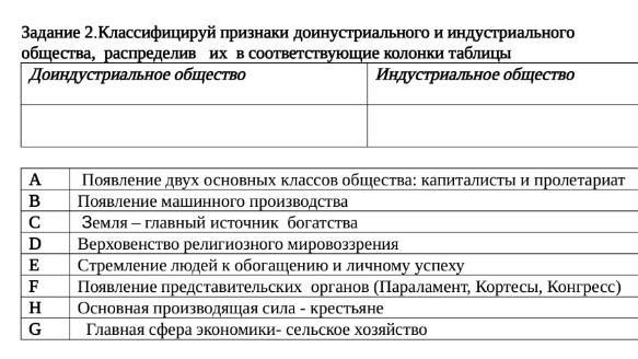 Классифицируй признаки доинустриального и индустриального общества, распределив их в соответствующие колонки таблицы