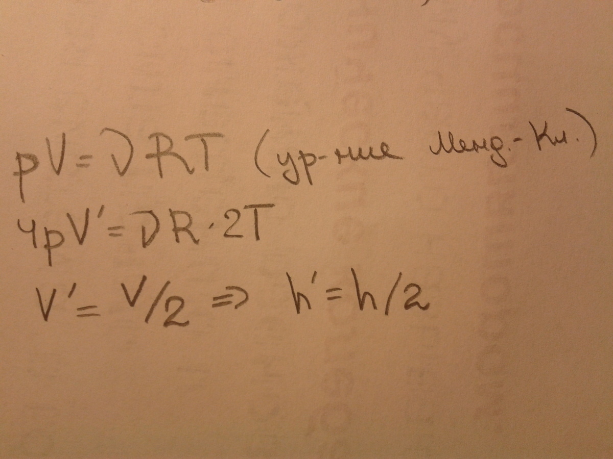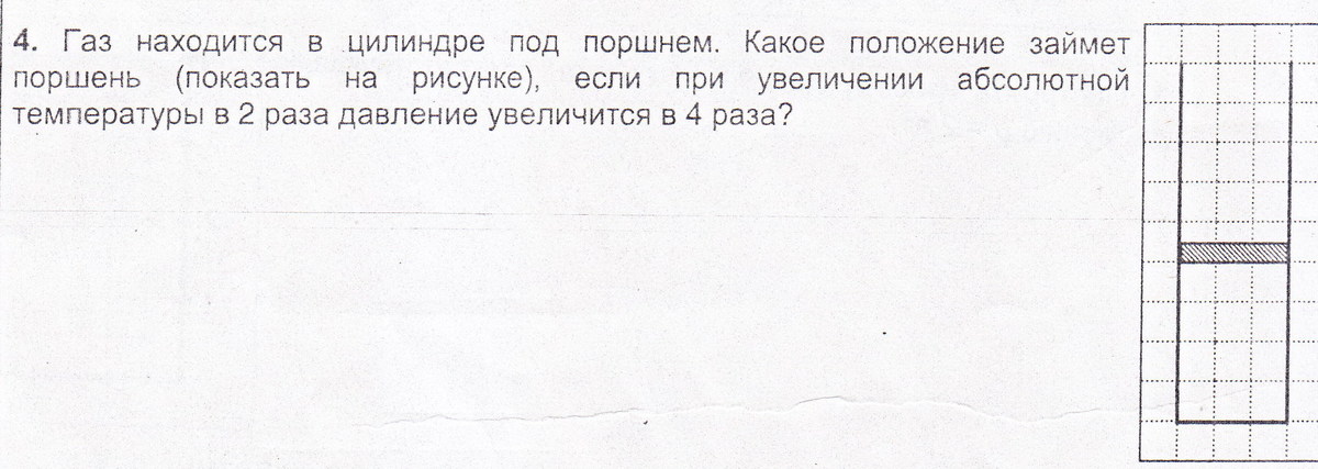 4. Газ находится в цилиндре под поршнем. Какое положение займет поршень, если при уменьшении абсолютной температуры в 2 раза давление уменьшится в 4 раза?