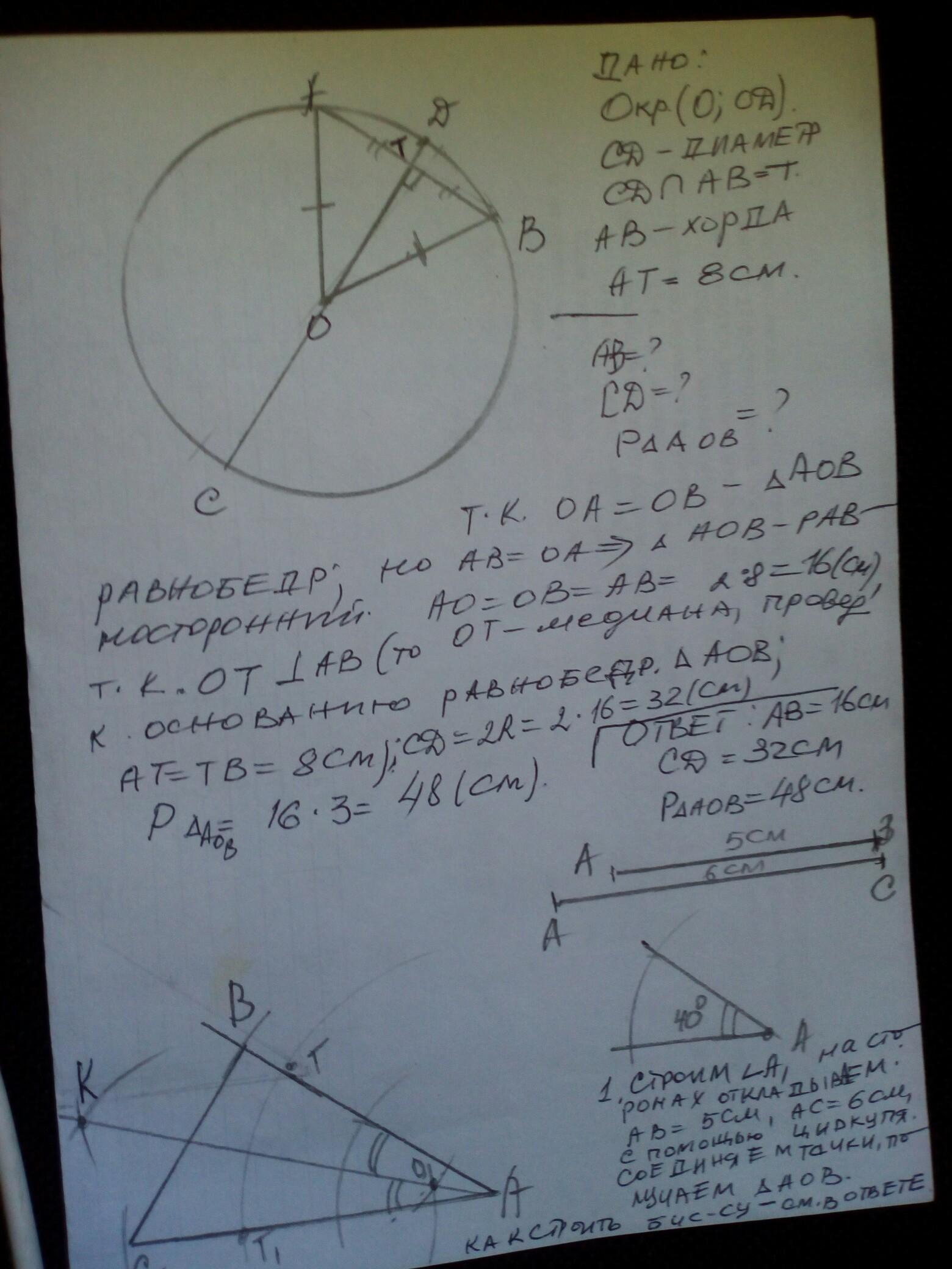 3.В окружности с центром в точке О к хорде АВ, равной радиусу окружности, перпендикулярно проведен диаметр СD. Диаметр CD и хорда AB пересекаются в точке T. Длина отрезка AT равна 8 см.
