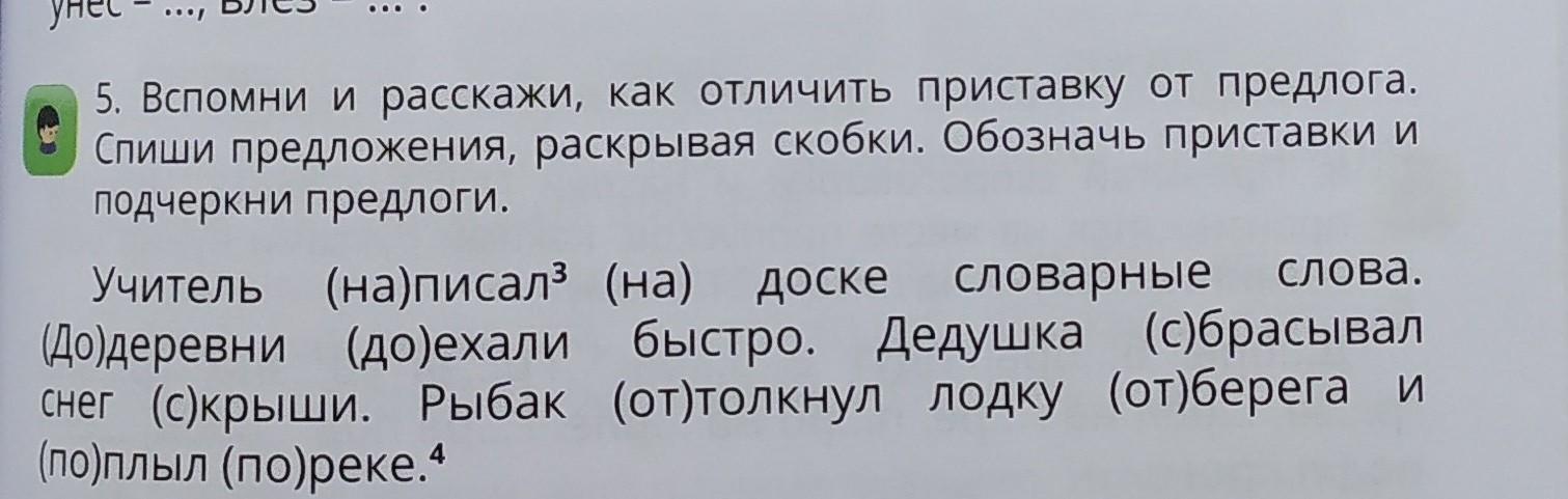 Учитель [на]писал на-(предлог) доске словарные слова. До(предлог) деревни [до]ехали быстро .Дедушка [с]брасывал снег с (предлог)крыши.Рыбак [от]толкнул лодку от(предлог) берега и поплыл по реке.