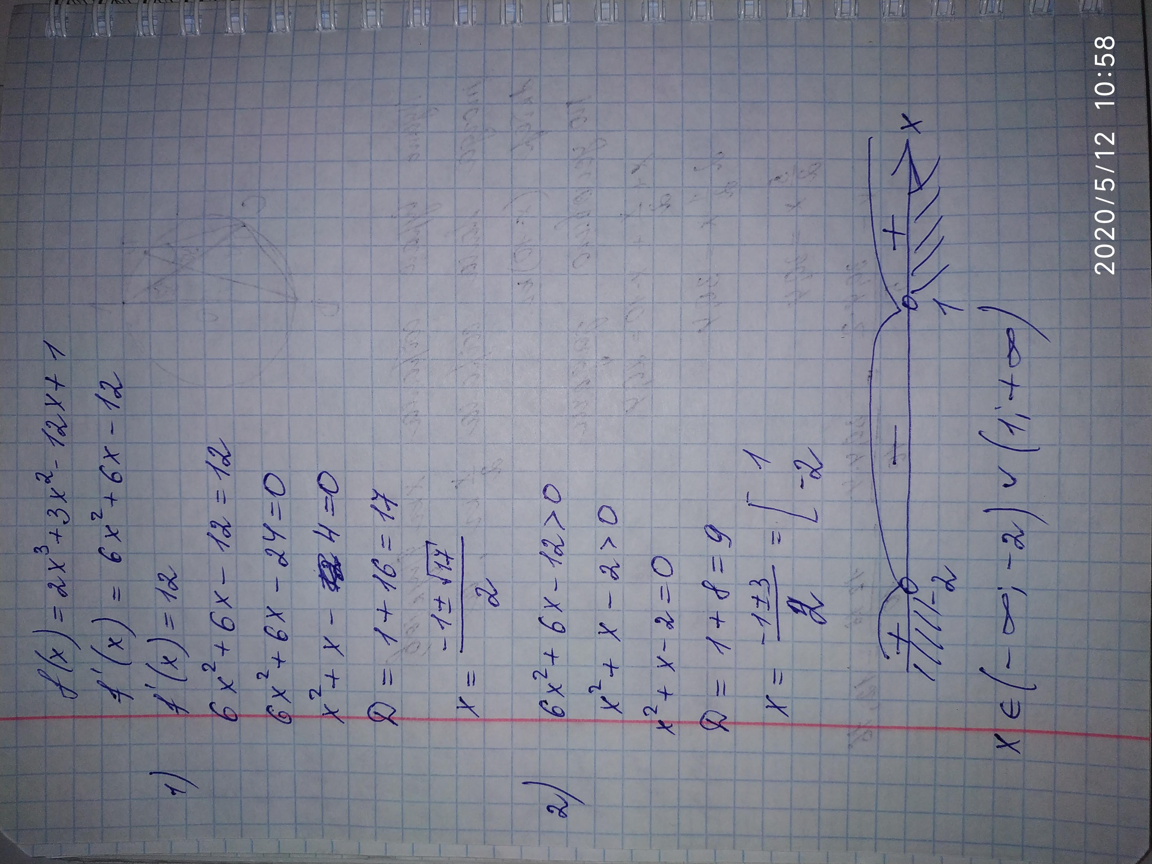 Дана функция f(x) = 2x^3 + 3x^2 - 12x + 1. Решите уравнение f '(x)= 12; решите неравенство f '(x)>0