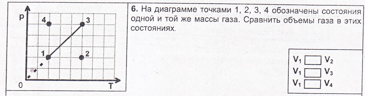 6. На диаграмме точками 1, 2, 3, 4 обозначены состояния одной и той же массы газа. Сравнить объёмы газа в этих состояниях.