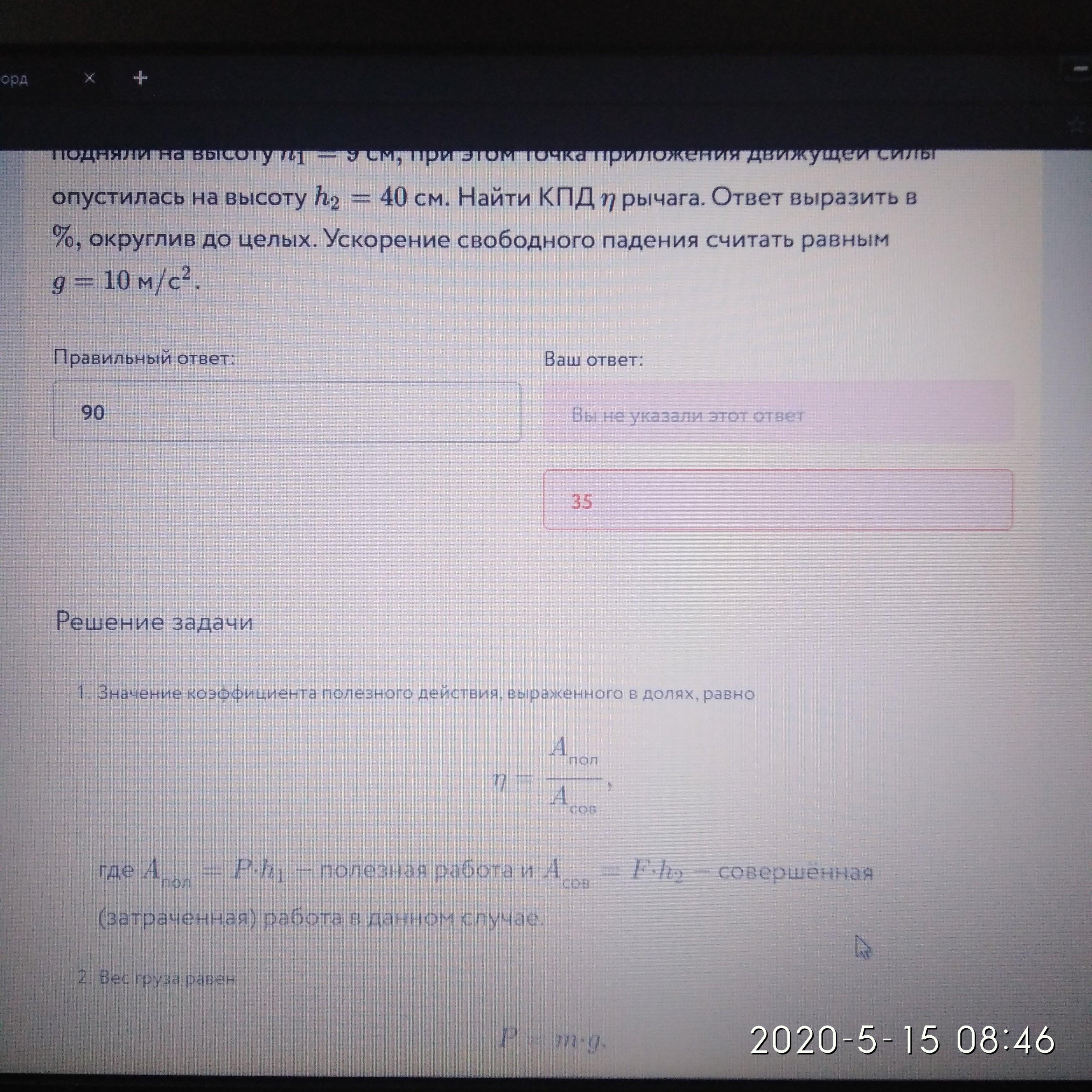 На коротком плече рычага подвешен груз массой кгm1=80 кг. Для подъёма этого груза к длинному плечу рычага приложили силу НF=200 Н. Груз подняли на высоту смh1=9 см, при этом точка приложения движущей силы опустилась на высоту смh2=40 см. Найти КПД η рычага. Ответ выразить в %, округлив до целых. Ускорение свободного падения считать равным мс