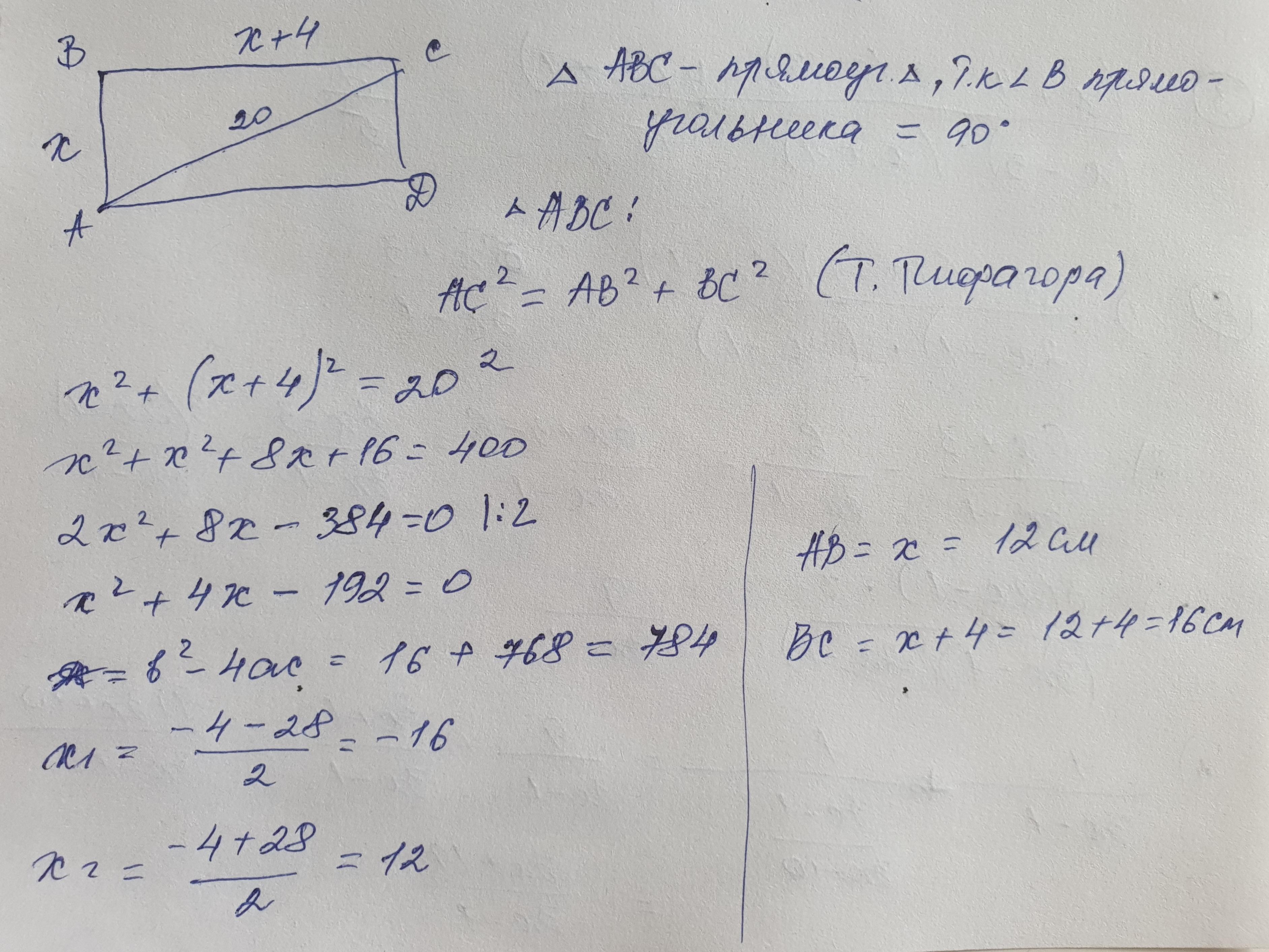 них на 4 см довша за другу, а діагональ прямокутника 20 см.