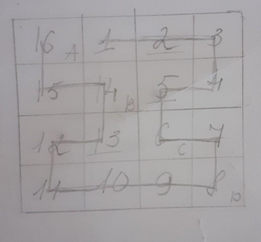Ксюша поставила фишку в одну из клеток квадрата 4x4. Она передвигала фишку по клеткам этого квадрата, каждый раз переходя из клетки в соседнею по стороне, и побывала в каждой клетке ровно один раз. В каждую клетку она записала номер хода, на котором фишка попадала в данную клетку (рисунок слева). Она сделала так ещё раз но записала только 3 хода (рисунок справа). Найдите, какие числа должны стоять в отмеченных клетках.
