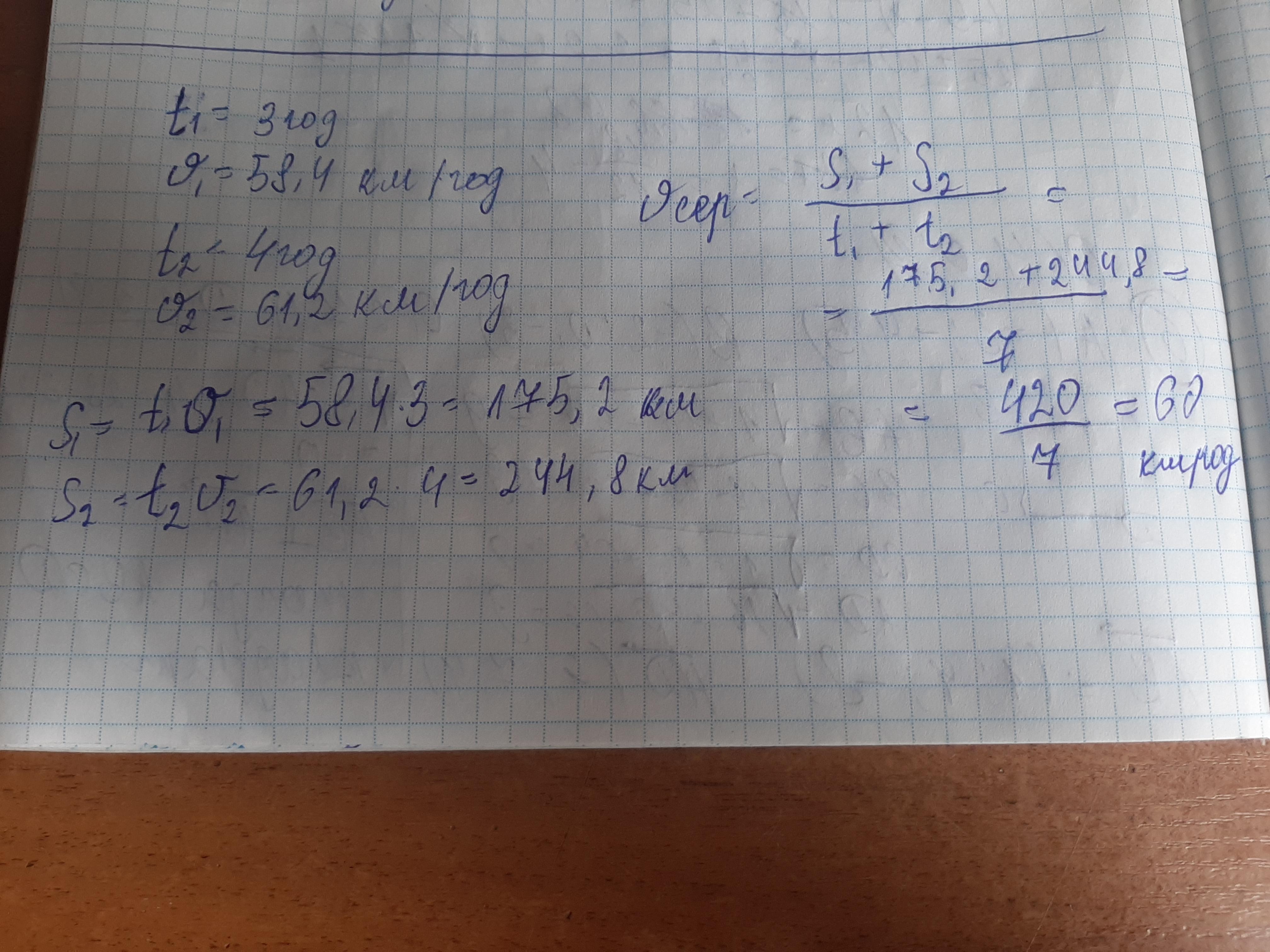 Машина їхала 3 год. Зі швидкістю 58,4 км/год і 4 год. Зі швидкістю 61,2 км/год. Знайти середню швидкість машини на всьому шляху