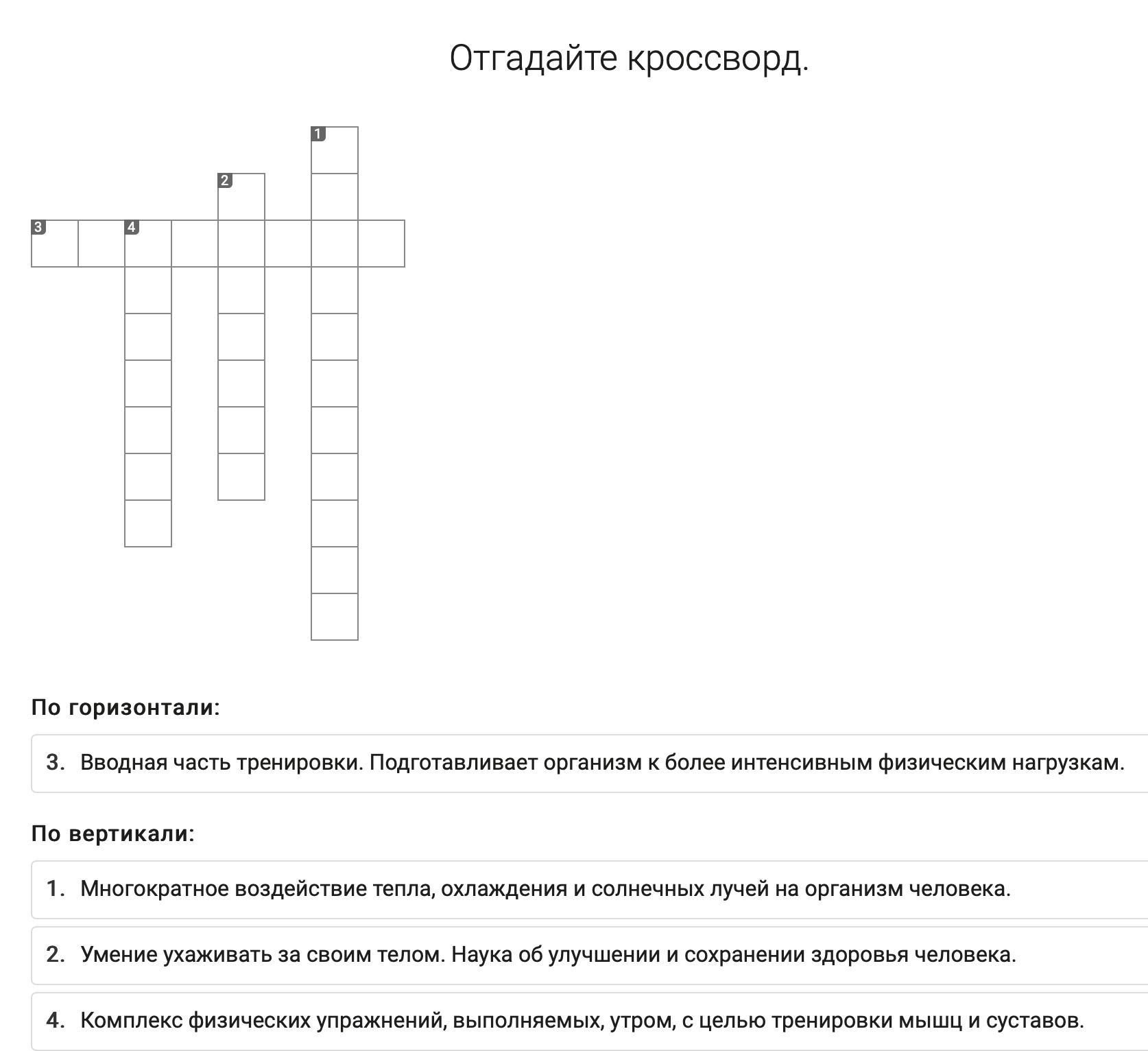 4- зарядка- комплекс физических упражнений, выполняемых утром, с целью тренировки мышц и суставов