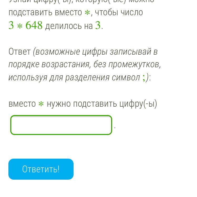 если мы число сложим 3+6+4+8 то получится 21 оно делится на 3. теперь надо поставить число что бы это число делилось на 3