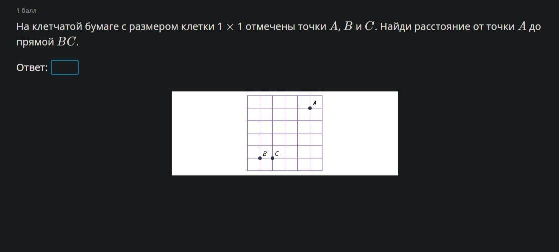 На клетчатой бумаге с размером клетки 1 на 1 отмечены точки A, В и С. Найдите расстояние от точки А до прямой ВС.