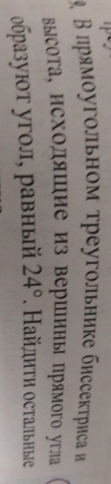 в прямоугольном треугольнике биссектриса и высота, исходящие из вершины прямого угла образуют угол, равный 24. Найдите остальные углы треугольника. Решите с объяснением пожалуйста!